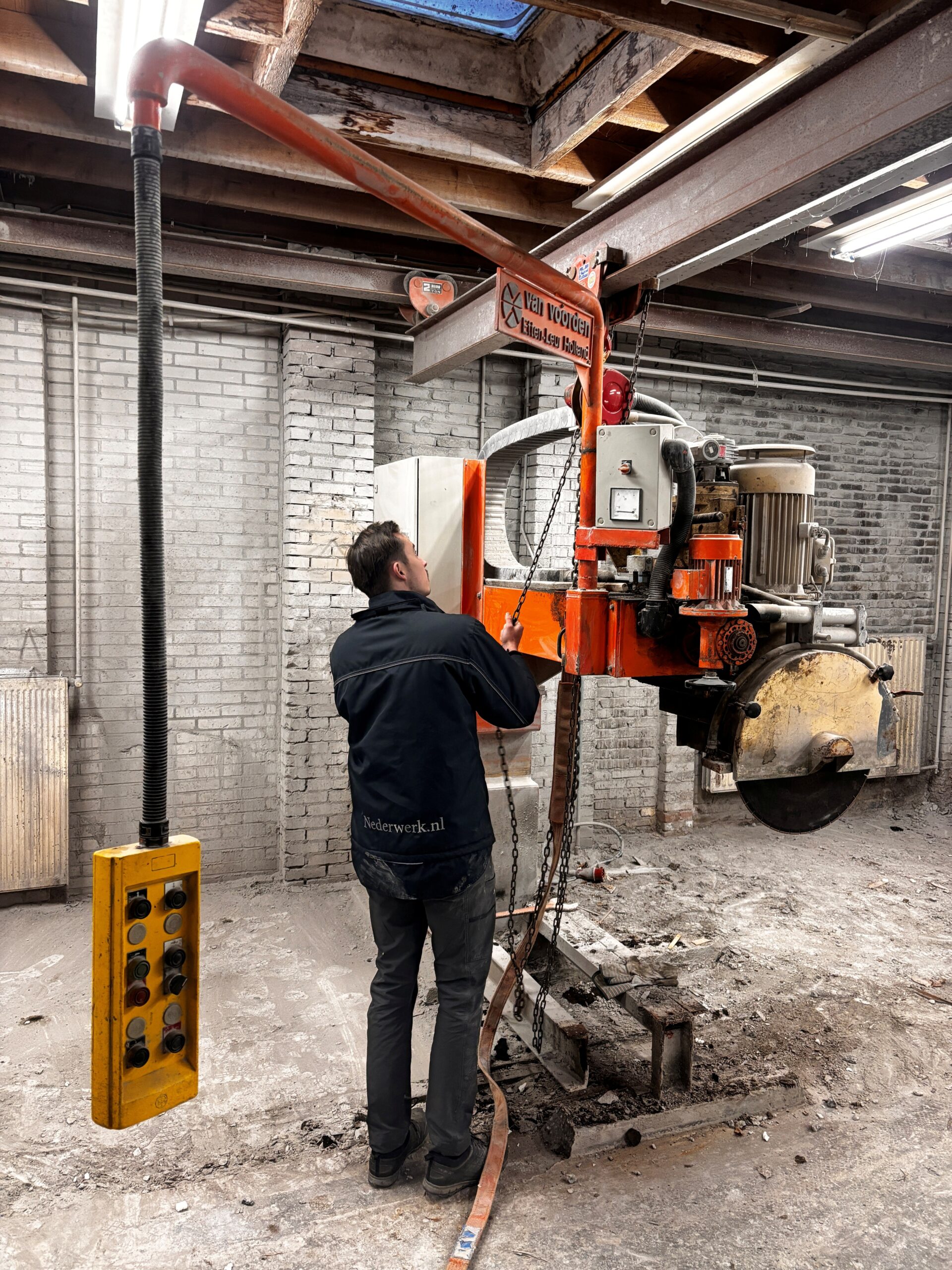 Vandaag zijn we opnieuw naar Hilversum gegaan om de zaagmachine te demonteren. Deze gaf zich niet zonder slag of stoot gewonnen, maar met vereende krachten, waaronder de hulp van Niels Harmsen en de heftruck van buurman Piet, is het gelukt. De machine is veilig op de wagen geladen en naar het Mercuriusplein vervoerd.